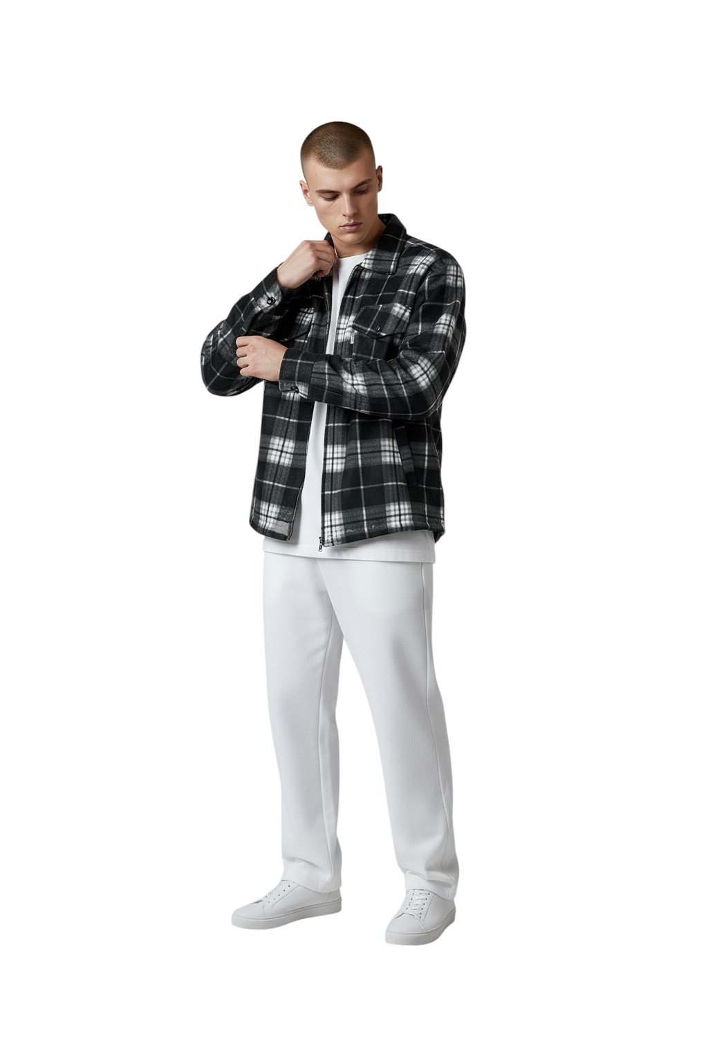 Model měří 194cm, jeho váha je 87kg, má na sobě velikost M-L